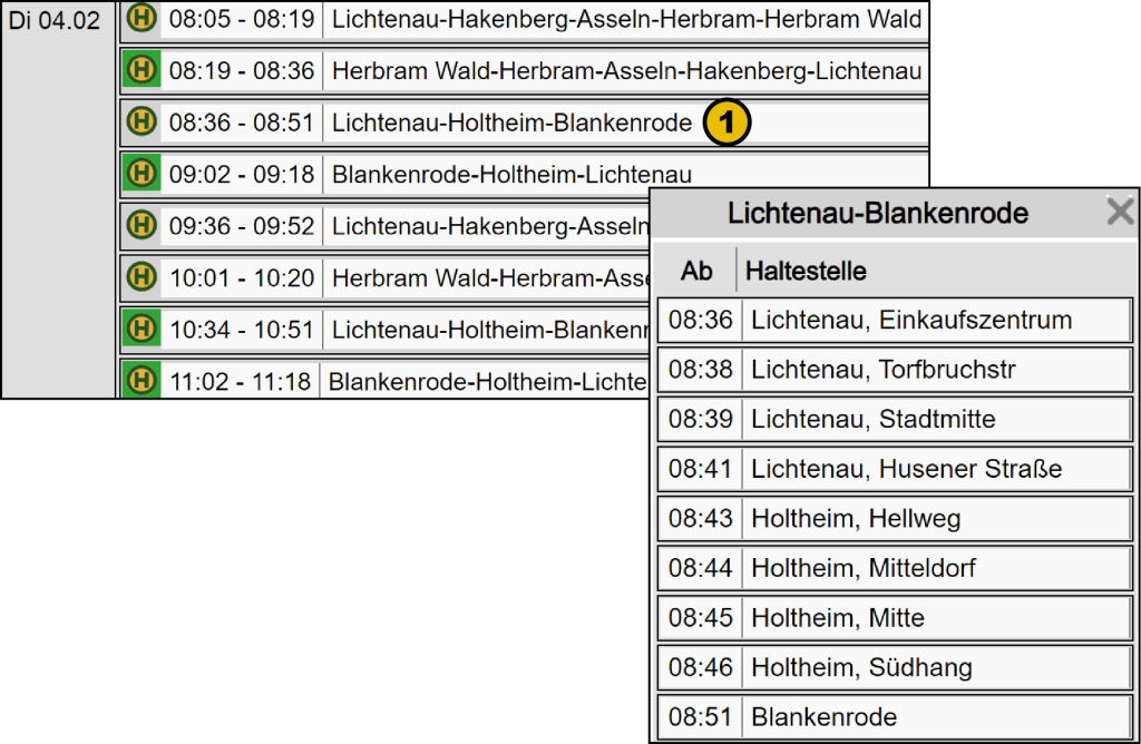 Klicke auf die gewünschte Verbindung (1). Ein Fenster mit den Haltestellen öffnet sich. Sieh dir die Farbe der gewünschten Haltestelle an: