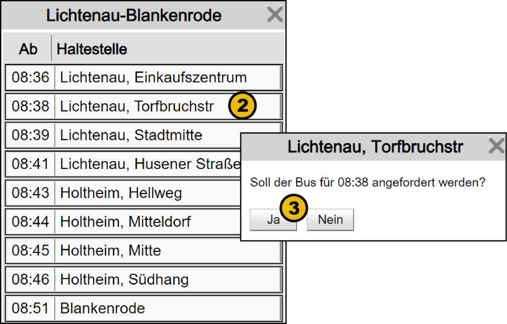 Es fehlt nicht mehr viel: Klicke nun auf die entsprechende Haltestelle, von wo du abfahren möchtest (2). Ein neues Fenster taucht auf, welches fragt, ob die Haltestelle tatsächlich angefordert werden soll. Bestätige dies (3). Im Anschluss wird deine Haltestell grün hinterlegt sein und du bist fertig. Gute Fahrt!
