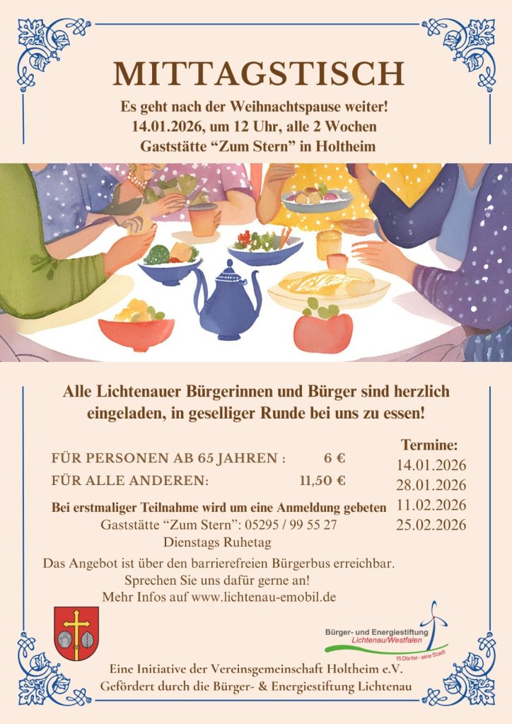 Der beliebte Mittagstisch in Holtheim geht in eine neue Runde! Dank der erneuten Unterstützung der Bürger- & Energiestiftung Lichtenau/Westfalen kann das Angebot im gewohnten zweiwöchigen Rhythmus stattfinden. Der Mittagstisch findet alle zwei Wochen mittwochs statt (14.01., 28.01., 11.02., 25.02.).